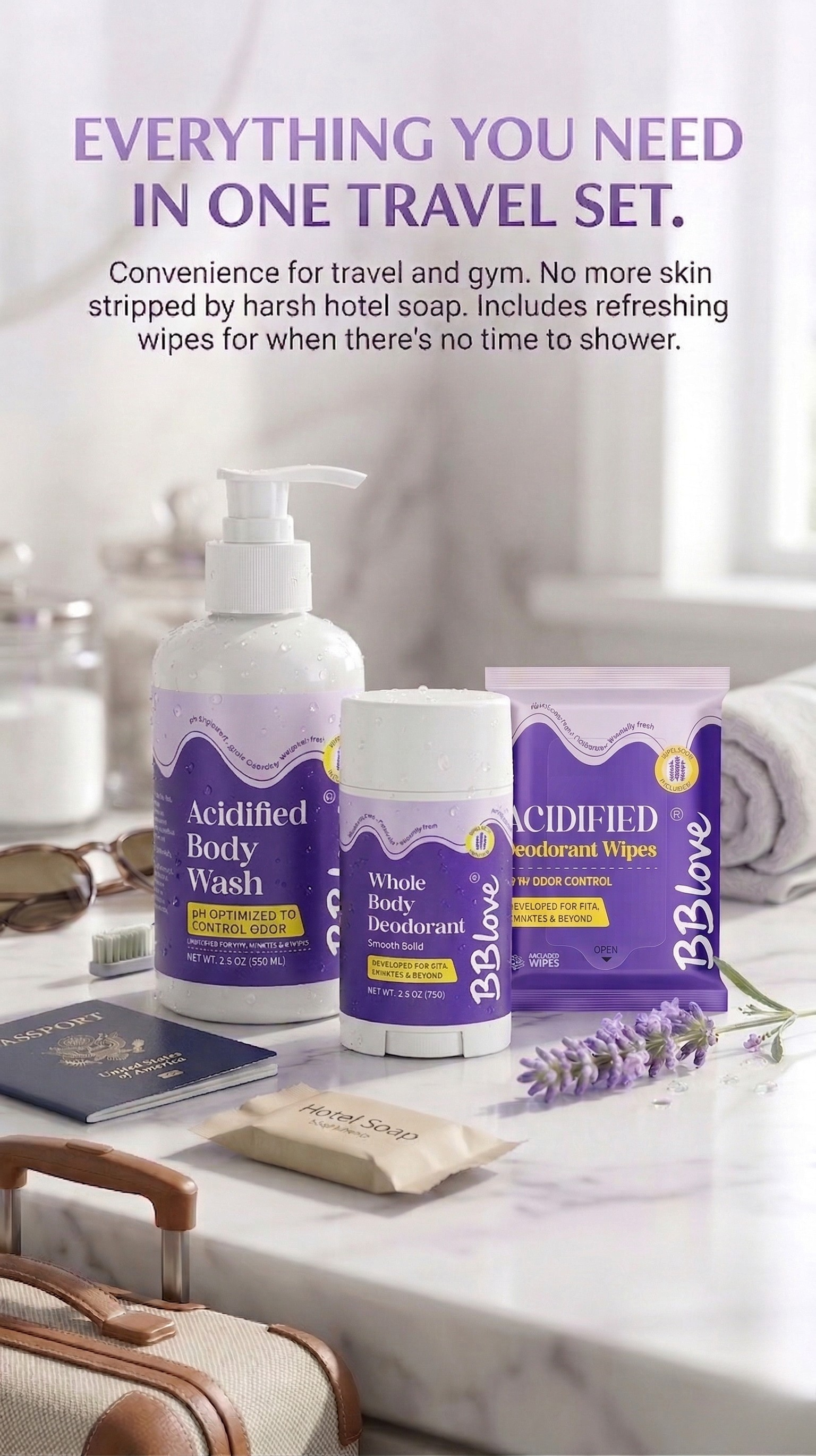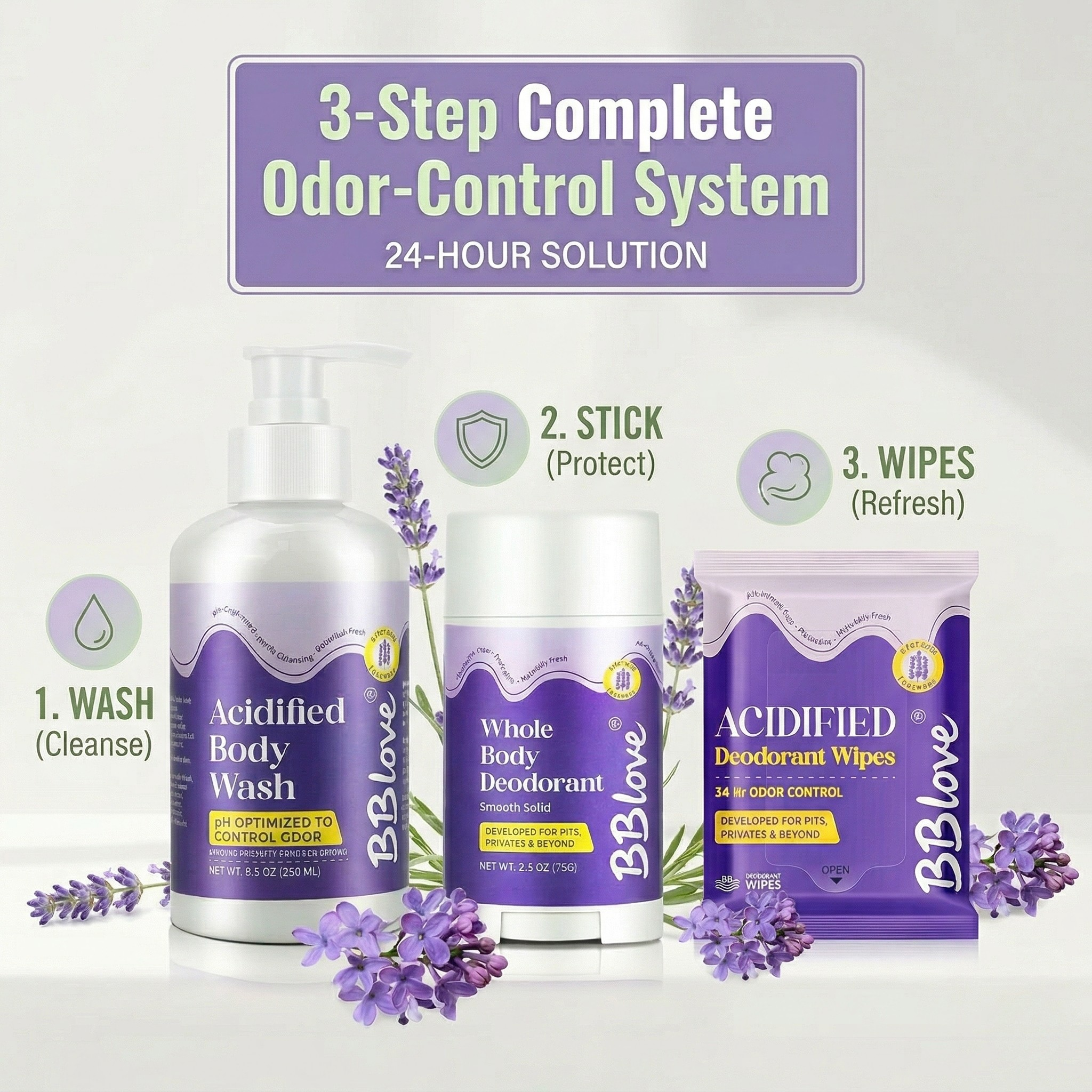 Start your ritual by neutralizing odor at the source. Our acidified formula stabilizes your skin’s pH, ensuring you feel fresh from the moment you step out of the shower.